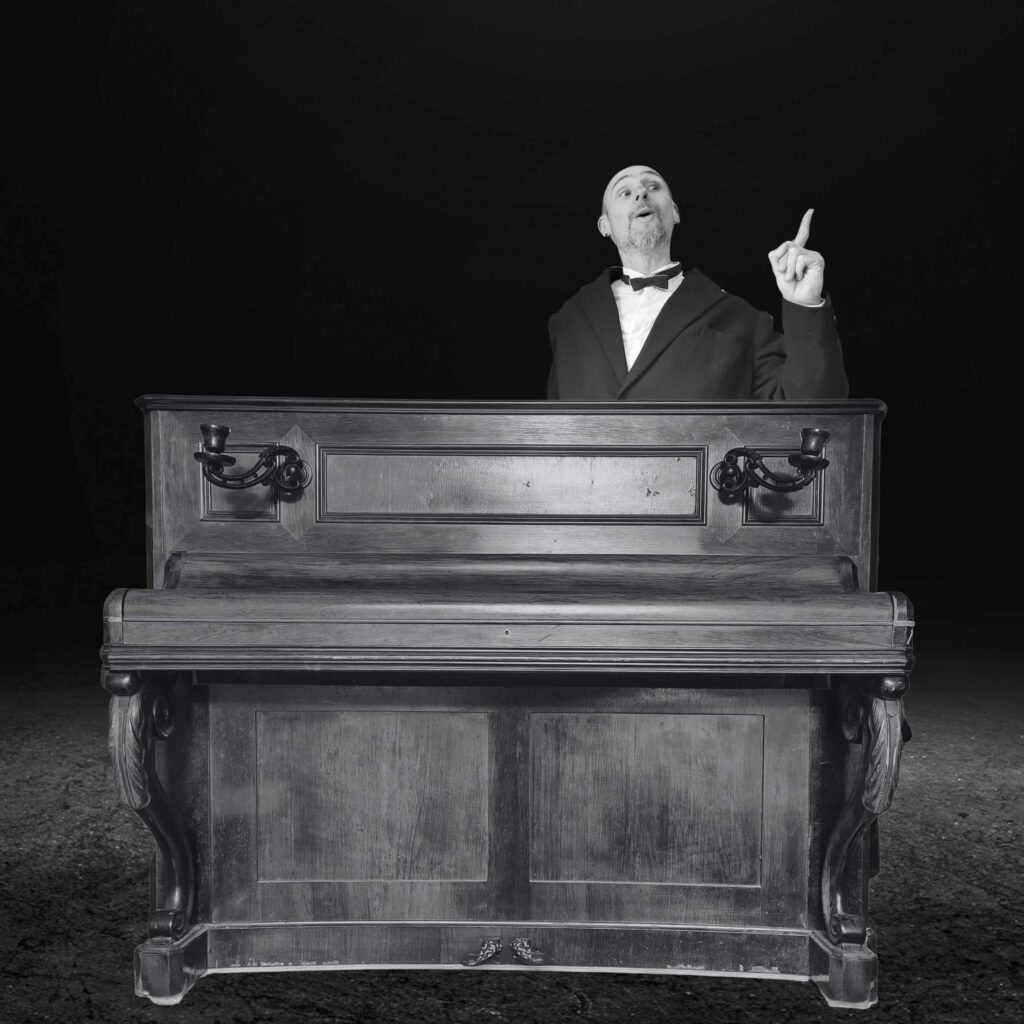 Dans un espace occupé par un piano, un homme arrive en tenue de chef d’orchestre, paumé, nerveux, maladroit car il sait que le reste de l’orchestre ne viendra pas. Petit à petit, il va apprivoiser le public pour essayer de remplacer les solistes et les chœurs. En mêlant voix, sons, bruitages et piano, et contre toute attente, le maestro et son orchestre de fortune vont donner un concert unique en son genre : une symphonie extra-ordinaire.